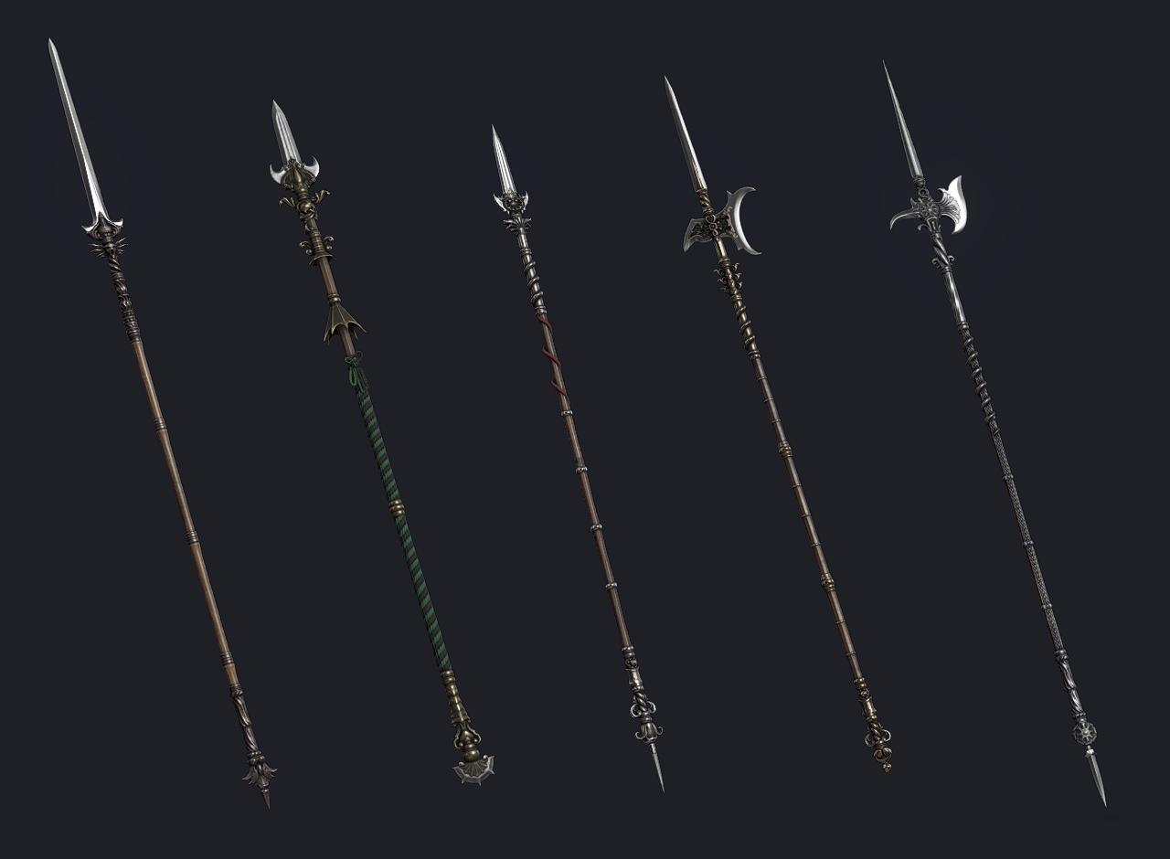 We have also been working on some improvements to our procedural item and material systems, some of these were urgent, but we've also got other things still in progress and can probably wait until after the update. We're working on some improvements to how materials and parts of objects blend together, adding more advanced effects to character materials and also expanding the procedural materials to work not only as part of our procedural item system, but as a general engine feature. This means we can give any object dynamic procedural materials, we can use them while authoring items which is great for our new tools and we can "break" the procedural item rules as needed. If for example an armour had a lot of additional elements that don't fit in our character layouts, we could add "modules" with custom layouts. We already made our weapon layouts more versatile and added some new features for compound elements to support some new weapons. Speaking of which, we're adding a first batch of the new ornate procedural weapons that we've teased a few times on our discord. These will be rare loot, and once we have more types we will probably also add them as alternative tournament rewards. Here's a few examples of some in game generated outputs: